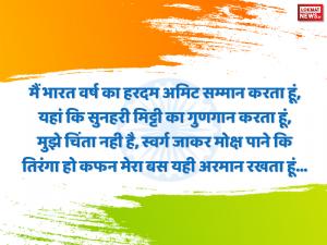 1 / 10मैं भारत वर्ष का हरदम अमिट सम्मान करता हूं, यहां कि सुनहरी मिट्टी का गुणगान करता हूं, मुझे चिंता नही है, स्वर्ग जाकर मोक्ष पाने कि तिरंगा हो कफन मेरा बस यही अरमान रखता हूं…2 / 10कुछ नशा तिरंगे की आन का है, कुछ नशा मातृभूमि की मान का है, हम लहराएंगे हर जगह इस तिरंगे को, ऐसा नशा ही कुछ हिंदुस्तान की शान का हैं…3 / 10इतनी सी बात हवाओं को बताए रखना, रौशनी होगी चिरागों को जलाये रखना, लहू लेकर की है जिसकी हिफाजत हमनें, ऐसे तिरंगे को दिल में हमेशा बसाए रखना…4 / 10आजादी की कभी शाम नही होने देंगे, शहीदों की कुर्बानी बदनाम नही होने देंगे, बची हो जो एक बूंद भी लहू की, तब तक भारत माता का आंचल निलाम नही होंगे देंगे…5 / 10वतन हमारा ऐसा है, की कोई छोड़ पाए न, रिश्ता हमारा ऐसा है, की कोई तोड़ पायें न, दिल हमारा एक है, एक हमारी जान हे, हिंदुस्तान हमारा है और हम इसकी शान हैं…6 / 10खुशनसीब होते है वो लोग, जो इस देश पर कुर्बान होते है, जान गवां कर भी वो लोग अमर हो जाते है, करते हैं सलाम उन देश प्रेमियों को, जिनके कारण इस तिरंगे का मान होता है…7 / 10दुश्मनी के लिए यह याद नहीं रहता, वतन मेरा दोस्ती पर कुर्बान है, नफरत पाले कोई उड़ान नहीं भरता, दिलों में चाहत ही मेरे वतन की शान है…8 / 10शहीदों की चिताओं पर लगेंगे हर बरस मेले, वतन पे मर मिटनेवालों का बाकी यही निशां होगा…9 / 10खून से खेलेंगे होली अगर वतन मुश्किल में है, सरफरोशी की तमन्ना अब हमारे दिल में है…10 / 10जो अब तक न खोला वो खून नहीं पानी है, जो देश की काम ना आये, वो बेकार जवानी है…
