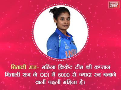 मिताली राज- महिला क्रिकेट टीम की कप्तान मिताली राज ने ODI में 6000 से ज्यादा रन बनाने वाली पहली महिला है।