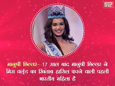 मानुषी छिल्लर- 17 साल बाद मानुषी छिल्लर ने मिस वर्ल्ड का खिताब हासिल करने वाली पहली भारतीय महिला है।