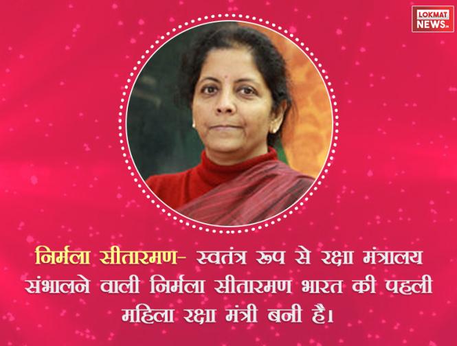 निर्मला सीतारमण- स्वतंत्र रूप से रक्षा मंत्रालय संभालने वाली निर्मला सीतारमण भारत की पहली महिला रक्षा मंत्री बनी है।