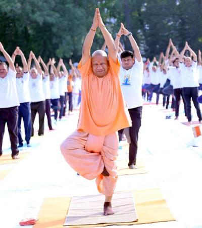 उत्तर प्रदेश के मुख्यमंत्री योगी आदित्यनाथ अंतर्राष्ट्रीय योग दिवस पर लखनऊ में आयोजित कार्यक्रम में पहुंचे। (फोटो: ट्विटर)