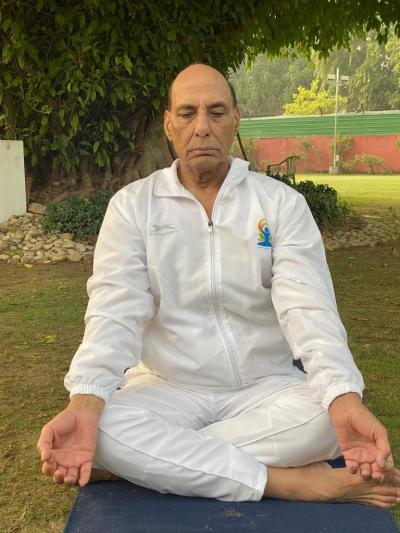 8वां अंतरराष्ट्रीय योग दिवस पर रक्षा मंत्री राजनाथ सिंह ने किया योग। (फोटो: ट्विटर)