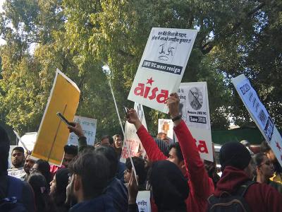 जेएनयू परिसर में पांच जनवरी के नकाबपोश हमले की घटना के मद्देनजर विश्वविद्यालय के कुलपति के इस्तीफे की मांग को लेकर छात्र मानव संसाधन विकास मंत्रालय तक मार्च निकाल रहे हैं।