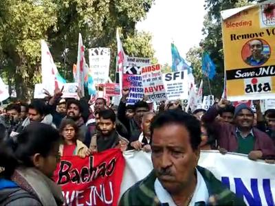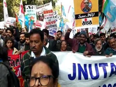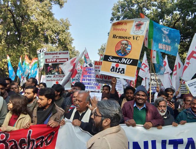 जवाहर लाल नेहरू विश्वविद्यालय में रविवार रात हुई हिंसा के विरोध में छात्रों और शिक्षकों का प्रोटेस्ट मार्च जारी है।