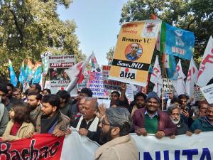 1 / 8जवाहर लाल नेहरू विश्वविद्यालय में रविवार रात हुई हिंसा के विरोध में छात्रों और शिक्षकों का प्रोटेस्ट मार्च जारी है। 2 / 8दिल्ली पुलिस ने छात्रों को पैदल मार्च की अनुमति नहीं दी।3 / 8जेएनयू के गेट पर भारी संख्या में पुलिस बल तैनात था। 4 / 8इसके बाद जेएनयू छात्रसंघ बसों के जरिए मंडी हाउस पहुंच रहे हैं।5 / 8छात्रों की मांग है कि जेएनयू के वाइस चांसलर एम जगदीश कुमार को पद से हटाया जाए।6 / 8जेएनयू छात्रों और शिक्षकों के मार्च के मद्देनजर बृहस्पतिवार मंडी हाउस पर बड़ी संख्या में सुरक्षा बलों को तैनात किया गया है। 7 / 8जेएनयू परिसर में पांच जनवरी के नकाबपोश हमले की घटना के मद्देनजर विश्वविद्यालय के कुलपति के इस्तीफे की मांग को लेकर छात्र मानव संसाधन विकास मंत्रालय तक मार्च निकाल रहे हैं। 8 / 8जिसे लेकर कुछ छात्रों ने वहां एकत्रित होना शुरू कर दिया है। पांच जनवरी के हमले में करीब 35 लोग घायल हुए थे।