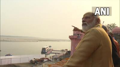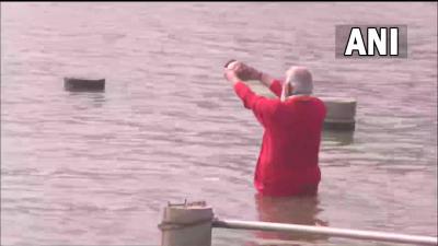 काशी विश्वनाथ धाम के लोकार्पण से पहले मां गंगा में डुबकी लगायी और सूर्यदेव को अध्र्य दिया।