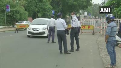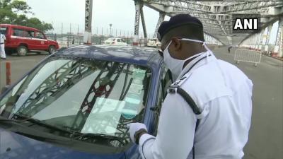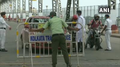 पश्चिम बंगाल के कोलकाता में लॉकडाउन के दौरान पुलिस वाहनों की जांच करते हुए। राज्य में 31 अगस्त तक हर हफ्ते 2 दिन लॉकडाउन रहेगा। कोरोना वायरस संक्रमण की कड़ी तोड़ने के लिए पश्चिम बंगाल में सप्ताह में दो दिन बंद के नियम के मद्देनजर बुधवार को सार्वजनिक स्थलों पर सन्नाटा पसरा हुआ है।