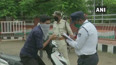 मध्य प्रदेश में लॉकडाउन के दौरान पुलिस लोगों के 'पहचान पत्र' की जांच करते हुए। कोरोना के बढ़ते मामलों के मद्देनज़र भोपाल में 10 दिन तक (4 अगस्त) लॉकडाउन किया गया है।
