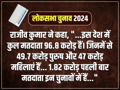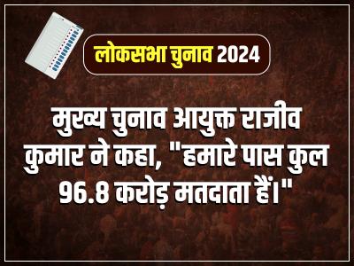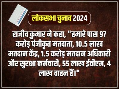 देश में 97 करोड़ पंजीकृत मतदाता हैं, 10.5 लाख से अधिक मतदान केंद्र हैं, 55 लाख ईवीएम का इस्तेमाल होगा। मुख्य निर्वाचन आयुक्त राजीव कुमार ने कहा कि हमारी टीम अब पूरी हो चुकी है, हम भारतीय लोकतंत्र के सबसे बड़े उत्सव के लिए पूरी तरह तैयार हैं।