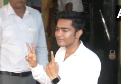 टीएमसी के राष्ट्रीय महासचिव और डायमंड हार्बर सीट से उम्मीदवार अभिषेक बनर्जी सातवें चरण के लिए एक मतदान केंद्र पर वोट डालने के बाद अपनी स्याही लगी उंगली दिखाते हुए।