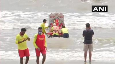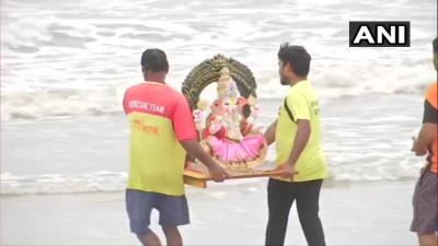 मुंबई : जुहू बीच पर कोरोना से एहतियात के लिए जारी दिशानिर्देशों का पालन करते हुए गणपति विसर्जन किया जा रहा है।
