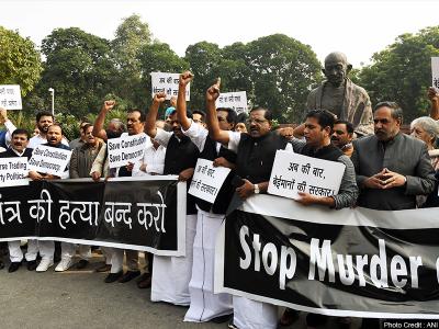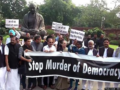 बाद में जब सदन की कार्यवाही शुरू हुई, तो विपक्षी नेताओं ने लोकसभा में प्रश्नकाल के दौरान नारेबाजी की और कहा, 'संविधान की हत्या बंद करो, बंद करो। इसके अलावा कांग्रेस सदस्यों ने महाराष्ट्र मुद्दे पर राज्यसभा में भी नारेबाजी की।