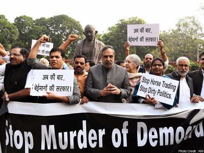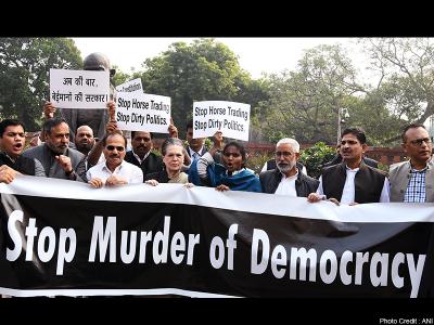 इस दौरान पार्टी सदस्यों के हाथों में बैनर भी दिखाई दिया, जिसमें 'लोकतंत्र की हत्या' करना बताया गया है। साथ ही साथ इसे रोकने की भी मांग की गई है।