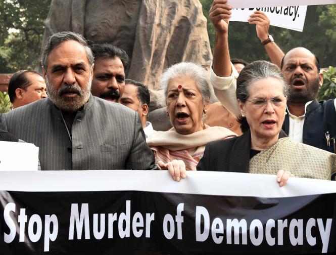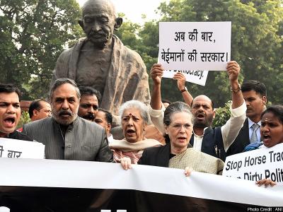 सोनिया गांधी के नेतृत्व में कांग्रेस ने सोमवार (25 नवंबर) को महाराष्ट्र सरकार गठन मुद्दे को लेकर संसद परिसर में विरोध प्रदर्शन किया।