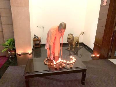 उत्तर प्रदेश मुख्यमंत्री योगी आदित्यनाथ अपने घर में जलाये दीये।