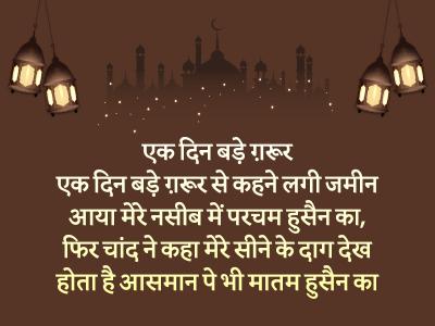 एक दिन बड़े ग़रूर एक दिन बड़े ग़रूर से कहने लगी जमीन आया मेरे नसीब में परचम हुसैन का, फिर चांद ने कहा मेरे सीने के दाग देख होता है आसमान पे भी मातम हुसैन का