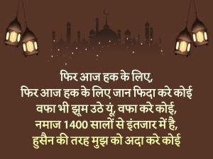 1 / 10फिर आज हक के लिए, फिर आज हक के लिए जान फिदा करे कोई वफा भी झूम उठे यूं, वफा करे कोई, नमाज 1400 सालों से इंतजार में है, हुसैन की तरह मुझ को अदा करे कोई2 / 10आंखों को कोई ख्वाब, आंखों को कोई ख्वाब तो दिखाई दे, तसबरा में इमाम का जलवा दिखाई दे, ऐ इब्न-ए-मुर्तज़ा तेरे सामने सूरज भी एक छोटा सा जर्रा दिखाई दे3 / 10जन्नत की आरजू में कहां जा रहे हैं लोग, जन्नत तो करबाला में खरीदी हुसैन ने, दुनिया-ओ-आंखिरत में जो रहना हो चैन से जीना अलि से सीखो मरना हुसैन से4 / 10कर्बला वालों का गम करबला वालों का गम घर घर में मनाया जाएगा मक्सद-ए-शबीर आलम को बताया जाएगा याद कर के जो ना रोया करबला वालों की प्यास कब्र से तिश्ना वो मेहशर में उठाया जाएगा5 / 10एक दिन बड़े ग़रूर एक दिन बड़े ग़रूर से कहने लगी जमीन आया मेरे नसीब में परचम हुसैन का, फिर चांद ने कहा मेरे सीने के दाग देख होता है आसमान पे भी मातम हुसैन का6 / 10सजदे से कर्बाला को बंदगी मिल गई सबर से उम्मत को जिंदगी मिल गई, एक चमन फतीमा का उजड़ा मगर सारे इस्लाम को जिंदगी मिल गई7 / 10तेरे दिल में कैसी गिरह पड़ी तेरे दिल में कैसी गिरह पड़ी तुझे उससे इतना हसद है क्यों, जो नबी की आंख का नूर है, जो अलि की रूह का चैन है, कभी देख अपने खामीर में, कभी पूछ अपने जमीर से, वो जो मिट गया वो यजीद था, जो ना मिट सका वो हुसैन था8 / 10यूं ही नहीं चर्चा हुसैन का, कुछ देख के हुआ था जमाना हुसैन का सर दे के दो जहां की हुकूमत खरीद ली महंगा पड़ा यजीद को सौदा हुसैन का9 / 10करीब अल्लाह के आओ तो कोई बात बने, इमान फिर से जगाओ तो कोई बात बने, लहू जो बह गया कर्बाला में, उसके मकसद को समझो तो कोई बात बने10 / 10जरूरत थी तलवार की ना और किसी हथियार की सिर्फ एक दुआ थी कर्बाला में आलमदार की फ़कत मिल जाए इज्जत अका हुसैन से तो याद दिला दूंगा जंग हैदर-ए-करार की