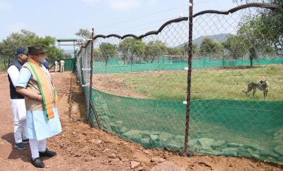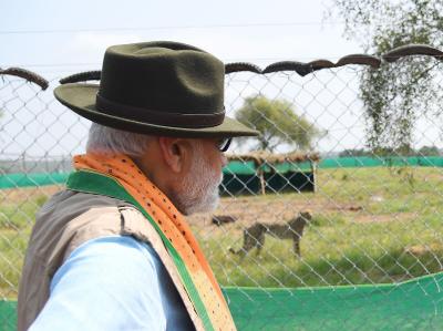 प्रधानमंत्री नरेंद्र मोदी ने शनिवार को मध्य प्रदेश के कुनो राष्ट्रीय उद्यान (केएनपी) में नामीबिया से लाए गए चीतों को एक विशेष बाड़े में छोड़ा। इस मौके पर मोदी अपने पेशेवर कैमरे से चीतों की कुछ तस्वीरें भी खींचते हुए दिखाई दिए। (फोटो ANI)