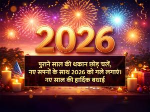 1 / 7पुराने साल की थकान छोड़ चलें, नए सपनों के साथ 2026 को गले लगाएं।2 / 7इस नए साल में हर सुबह नई उम्मीद और हर शाम सुकून लेकर आए। 2026 आपके लिए खुशियों से भरा हो।3 / 72026 में हर सपना पूरा हो, हर खुशी आपके पास आए और आपका हर दिन खुशहाल बने।4 / 7नववर्ष आपके जीवन में स्वास्थ्य, सफलता और शांति लेकर आए। 2026 की ढेरों शुभकामनाएं!5 / 7आइए 2026 का स्वागत मुस्कान, प्यार और खुशियों के साथ करें। नया साल मंगलमय हो!6 / 7कल की फिक्र छोड़ आज मुस्कुराएं, पूरे दिल से 2026 का स्वागत करें।7 / 7नए साल में नई खुशियाँ, नई उम्मीदें और नई सफलताएं आपके जीवन में आएं। 2026 की हार्दिक शुभकामनाएं!