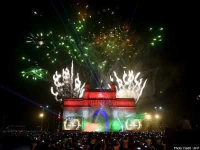 मुंबई के गेटवे ऑफ़ इंडिया पर तिरंगे के आधार पर लाइटिंग की गई थी और आतिशबाजी भी वैसी ही थी।