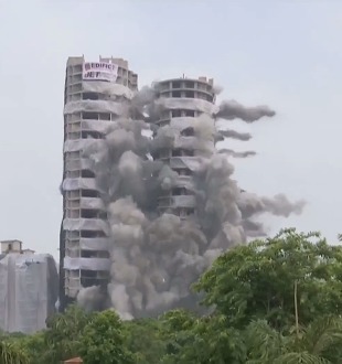 नोएडा के सेक्टर-93-ए में सुपरटेक के करीब 100 मीटर ऊंचे अवैध ट्विन टावर को रविवार दोपहर नियंत्रित विस्फोटकों की मदद से ढहा दिया गया। (फोटो: Twitter)