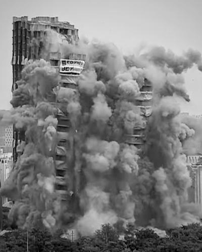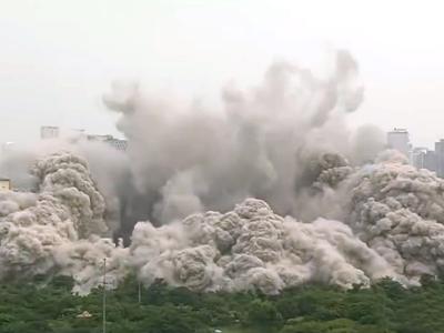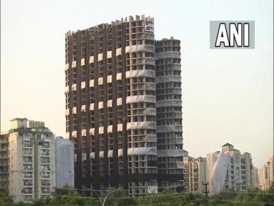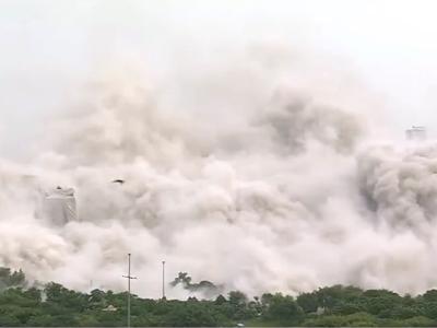ध्वस्तीकरण के मद्देनजर ट्विन टावर के आसपास के लगभग 500 वर्ग मीटर के क्षेत्र को वर्जित क्षेत्र में तब्दील कर दिया गया है, जहां किसी भी इंसान, वाहन या जानवर को जाने की अनुमति नहीं थी। (फोटो: Twitter)