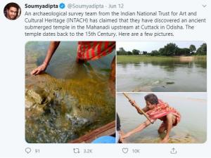 1 / 4इंडियन नेशनल ट्रस्ट फॉर आर्ट एंड कल्चरल हेरिटेज (INTACH) की पुरातत्व सर्वेक्षण टीम ने हाल ही में दावा किया है कि उन्होंने कटक से महानदी में एक प्राचीन जलमग्न मंदिर की खोज की। (फोटो सोर्स- ट्विटर)2 / 4बताया जा रहा है कि यह मंदिर लगभग 500 साल पुराना है। इंडिया टुडे के अनुसार, इंडियन नेशनल ट्रस्ट फॉर आर्ट एंड कल्चरल हेरिटेज (INTACH) के प्रोजेक्ट असिस्टेंट दीपक कुमार नायक ने बताया कि ओडिशा के नयागढ़ स्थित बैद्येश्वर के पास महानदी की शाखा पद्मावती नदी के बीच में मंदिर मौजूद है। (फोटो सोर्स- ट्विटर)3 / 4उन्होंने ये भी बताया कि करीब 60 फीट ऊंचे इस मंदिर के मस्तक, उसके निर्माण कार्य और वास्तुशिल्प को देखकर ये प्रतीत होता है कि यह 15वीं या 16वीं सदी में बनाया गया हैं। मीडिया रिपोर्ट्स के मुताबिक, ये मंदिर जिस स्थान पर मिला है, उस इलाके को सतपताना कहा जाता है। भगवान गोपीनाथ की पूजा यहां सातों गांव करते थे, जिसके कारण ये मंदिर उसी समय बनवाया गया था। (फोटो सोर्स- ट्विटर)4 / 4जानकारी के अनुसार, करीब 150 साल पहले बाढ़ आने के कारण नदी का प्रवाह बदल गया, जिसके चलते पूरा गांव इसकी चपेट में आने से डूब गया। ऐसे में यहां के सातों गांव और मंदिर डूब गए। दीपक कुमार का कहना है कि 19वीं सदी के आसपास ही ये घटना हुई है। पद्मावती नदी गांव के स्थानीय लोगों ने कहा कि क्षेत्र में लगभग 22 मंदिर हैं जो पानी के भीतर हैं, लेकिन भगवान गोपीनाथ के मंदिर का केवल मस्तक पिछले कुछ वर्षों से दिखाई दे रहा था क्योंकि यह सबसे लंबा मंदिर था। (फोटो सोर्स- ट्विटर)