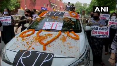 इस दौरान ये महिला कांग्रेस के ये कार्यकर्ता हाथ में तख्ती लिए नजर आए और केंद्र की नरेंद्र मोदी सरकार के खिलाफ नारेबाजी की। इन्होंने प्रदर्शन के दौरान पूरी कार को एक अर्थी का रूप दे दिया था।