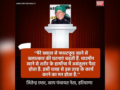 ''मेरे ख्याल से फास्टफूड खाने से बलात्कार की घटनाएं बढ़ती हैं. चाउमीन खाने से शरीर के हार्मोन्स में असंतुलन पैदा होता है. इसी वजह से इस तरह के कार्य करने का मन होता है.'' जितेन्द्र छत्तर, खाप पंचायत नेता, हरियाणा