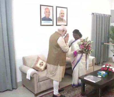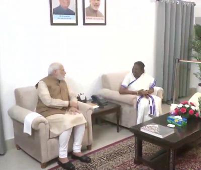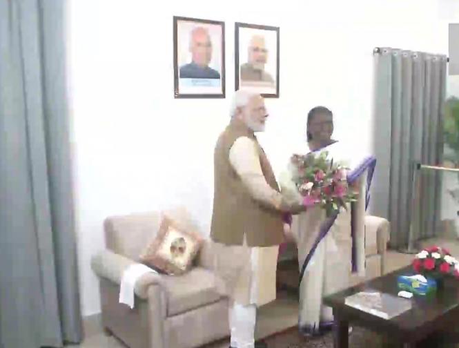 प्रधानमंत्री नरेंद्र मोदी द्रौपदी मुर्मू को जीत की बधाई देने उनके घर पहुंचे। राष्ट्रपति चुने जाने पर बधाई और शुभकामनाएं दी हैं।