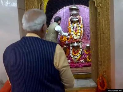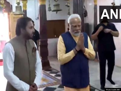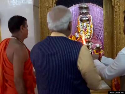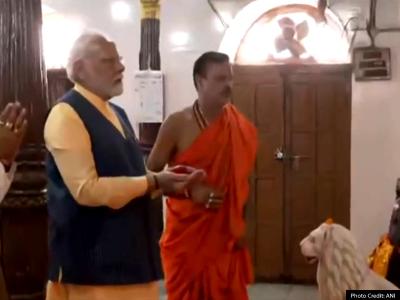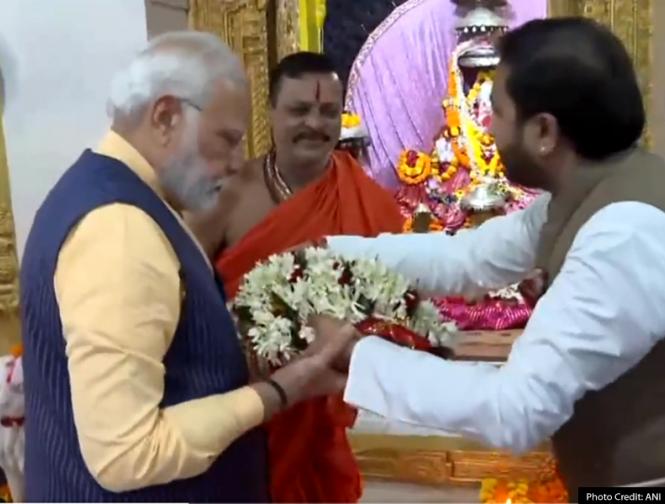 तस्वीरों में मोदी मंदिर में आरती करते नजर आ रहे हैं।