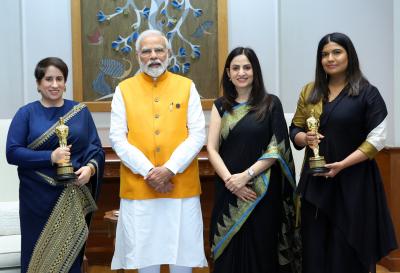 प्रधानमंत्री नरेंद्र मोदी ने गुनीत मोंगा और कार्तिकी गोंसाल्विस के साथ तस्वीर शेयर की है, जिसमे प्रधानमंत्री ऑस्कर की ट्राफी को हाथ में पकडे हुए दिखाई दे रहे हैं। (फोटो: Twitter)
