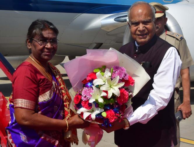 राष्ट्रपति द्रौपदी मुर्मू का राज्यपाल बनवारीलाल पुरोहित और मुख्यमंत्री भगवंत मान ने हवाईअड्डे पर स्वागत किया। (फोटो: Twitter)