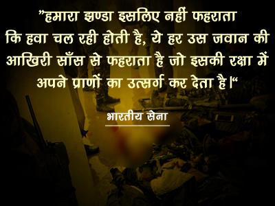 हमारा झण्डा इसलिए नहीं फहराता कि हवा चल रही होती है, ये हर उस जवान की आखिरी साँस से फहराता है जो इसकी रक्षा में अपने प्राणों का उत्सर्ग कर देता है।