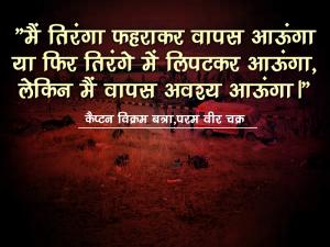 1 / 8मैं तिरंगा फहराकर वापस आऊंगा या फिर तिरंगे में लिपटकर आऊंगा, लेकिन मैं वापस अवश्य आऊंगा।2 / 8जो आपके लिए जीवनभर का असाधारण रोमांच है, वो हमारी रोजमर्रा की जिंदगी है।3 / 8यदि अपना शौर्य सिद्ध करने से पूर्व मेरी मृत्यु आ जाए तो ये मेरी कसम है कि मैं मृत्यु को ही मार डालूँगा।4 / 8हमारा झण्डा इसलिए नहीं फहराता कि हवा चल रही होती है, ये हर उस जवान की आखिरी साँस से फहराता है जो इसकी रक्षा में अपने प्राणों का उत्सर्ग कर देता है।5 / 8हमें पाने के लिए आपको अवश्य ही अच्छा होना होगा, हमें पकड़ने के लिए आपको तीव्र होना होगा, किन्तु हमें जीतने के लिए आपको अवश्य ही बच्चा होना (धोखा देना) होगा।6 / 8यदि कोई व्यक्ति कहे कि उसे मृत्यु का भय नहीं है तो वह या तो झूठ बोल रहा होगा या फिर वो गोरखा ही होगा।7 / 8आतंकवादियों को माफ करना ईश्वर का काम है, लेकिन उनकी ईश्वर से मुलाकात करवाना हमारा काम है।8 / 8इसका हमें अफसोस है कि अपने देश को देने के लिए हमारे पास केवल एक ही जीवन है।