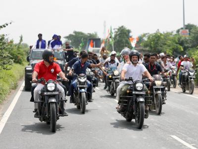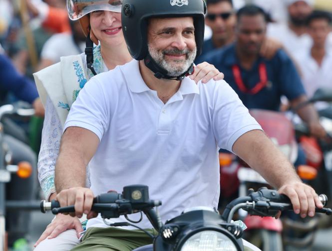 राहुल गांधी ने रैली में बुलेट मोटरसाइकिल चलाई उनके पीछे प्रियंका गांधी बैठी हुई थीं। फोटो क्रेडिट: x.com/INCIndia