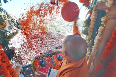 Rangotsav 2025 in Barsana: कार्यक्रम में मुख्यमंत्री ने संतों का सम्मान किया और देश-दुनिया से आए लोगों को होली व रंगोत्सव की शुभकामनाएं दीं।