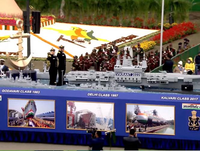 गणतंत्र दिवस पर भारतीय नौसेना की झांकी ने भाग लिया। झांकी को नौसेना की 'आत्मनिर्भर भारत' के तहत प्रमुख प्रेरणों को उजागर करने के उद्देश्य से बनाया गया है। (फोटो: ट्विटर)