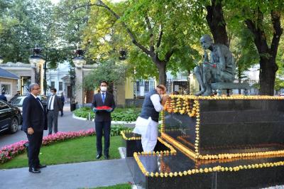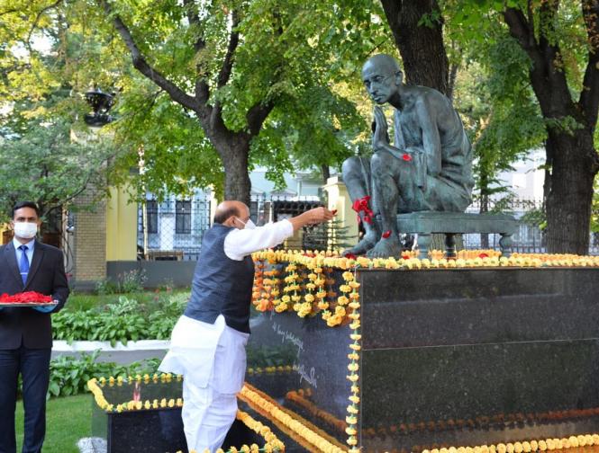 रक्षा मंत्री राजनाथ सिंह ने मास्को स्थित भारतीय दूतावास में बृहस्पतिवार को महात्मा गांधी को पुष्पांजलि अर्पित की। सिंह शंघाई सहयोग संगठन (एससीओ) की अहम बैठक में शिरकत करने के लिए बुधवार को तीन दिवसीय यात्रा पर यहां पहुंचे।
