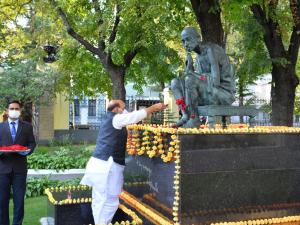 1 / 11रक्षा मंत्री राजनाथ सिंह ने मास्को स्थित भारतीय दूतावास में बृहस्पतिवार को महात्मा गांधी को पुष्पांजलि अर्पित की। सिंह शंघाई सहयोग संगठन (एससीओ) की अहम बैठक में शिरकत करने के लिए बुधवार को तीन दिवसीय यात्रा पर यहां पहुंचे।2 / 11यह करीब दो महीनों में उनकी दूसरी रूस यात्रा है। रक्षा मंत्री ने ट्वीट किया, ‘‘मास्को में भारतीय दूतावास में बापू की प्रतिमा पर पुष्प अर्पित किए। महात्मा गांधी को श्रद्धांजलि देता हूं।’’ सिंह के साथ रूस में भारत के राजदूत डी बी वेंकटेश वर्मा भी थे। इस दौरान सिंह ने मास्क लगाया हुआ था और वह गांधी की प्रतिमा के आगे हाथ जोड़कर सिर झुकाए देखे गए।3 / 11रक्षा मंत्री राजनाथ सिंह ने शंघाई सहयोग संगठन (एससीओ) की बैठक से पहले शुक्रवार को रूसी सशस्त्र बलों के मॉस्को स्थित मुख्य ‘कैथेड्रल’ और संग्रहालय परिसर का दौरा किया।4 / 11सिंह यहां एससीओ देशों के रक्षा मंत्रियों की बैठक में शामिल होने पहुंचे हैं। उन्होंने अपने दौरे के तीसरे दिन की शुरुआत अपने प्रतिनिधिमंडल के साथ ‘कैथेड्रल’ का दौरा करने के साथ की।5 / 11रक्षा मंत्रालय के प्रवक्ता ने एक ट्वीट में कहा, ‘‘रक्षा मंत्री राजनाथ सिंह ने आज सुबह रूसी संघ के सशस्त्र बलों के मॉस्को स्थित मुख्य कैथेड्रल और संग्रहालय परिसर का दौरा किया।’’6 / 11मंत्रालय ने टि्वटर पर दो तस्वीरें भी पोस्ट कीं जिनमें राजनाथ रूसी और भारतीय अधिकारियों के साथ ‘कैथेड्रल’ के अंदर दिखाई देते हैं। रूसी संघ के सशस्त्र बलों का यह मुख्य गिरजाघर इस साल 20 जून को ही खुला था।7 / 11यह सेना को समर्पित ऑर्थोडॉक्स ईसाइयों का एक विशाल चर्च है। सिंह ने बृहस्पतिवार को कहा था कि रूसी समकक्ष जनरल सर्गेई शोइगू के साथ उनकी ‘‘शानदार बैठक’’ हुई। इस दौरान उन्होंने भारत की रक्षा और सुरक्षा आवश्यकताओं के लिए रूस की मदद की सराहना की।8 / 11रक्षा मंत्री ने इस दौरान रूस द्वारा भारत को कई अस्त्र प्रणालियों, गोला-बारूद और सैन्य उपकरणों की आपूर्ति की प्रक्रिया तेज किए जाने पर जोर दिया, जिनके लिए शुरू में करार हो चुके हैं। दोनों देशों ने एके-47 203 राइफलों के भारत में विनिर्माण के लिए एक बड़े सौदे को भी अंतिम रूप दिया। 9 / 11रक्षा मंत्री राजनाथ सिंह ने बृहस्पतिवार को कहा कि उन्होंने अपने रूसी समकक्ष जनरल सर्गेई शोइगू के साथ यहां एक ‘‘शानदार बैठक’’ की। इस दौरान उन्होंने देश की रक्षा एवं सुरक्षा जरूरतों को पूरा करने में रूस द्वारा मुहैया की गई सहायता की सराहना की। सिंह, शंघाई सहयोग संगठन (एससीओ) की एक महत्वपूर्ण बैठक में भाग लेने के लिए तीन दिवसीय यात्रा पर बुधवार को यहां पहुंचे हैं।10 / 11सिंह ने पहले हुए समझौतों के तहत रूस द्वारा भारत को कई हथियार प्रणालियों, गोला बारूद और कल पुर्जों की आपूर्