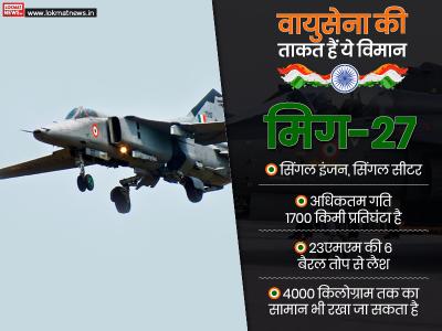 मिग-27: सिंगल इंजन, सिंगल सीटर, अधिकतम गति 1700 किमी प्रतिघंटा है, 23एमएम की 6 बैरल तोप से लैश, 4000 किलोग्राम तक का सामान भी रखा जा सकता है