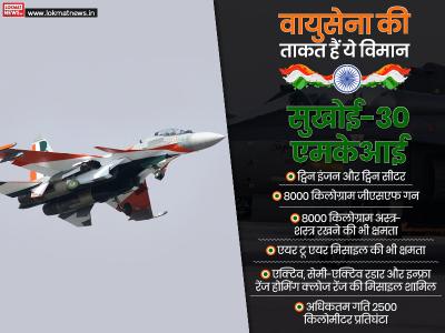 सुखोई-30 एमकेआई: ट्विन इंजन और ट्विन सीटर, 8000 किलोग्राम जीएसएफ गन, 8000 किलोग्राम अस्त्र-शस्त्र रखने की भी क्षमता, एयर टू एयर मिसाइल की भी क्षमता एक्टिव, सेमी-एक्टिव रडार और इन्फ्रा रेंज होमिंग क्लोज रेंज की मिसाइल शामिल, अधिकतम गति 2500 किलोमीटर प्रतिघंटा
