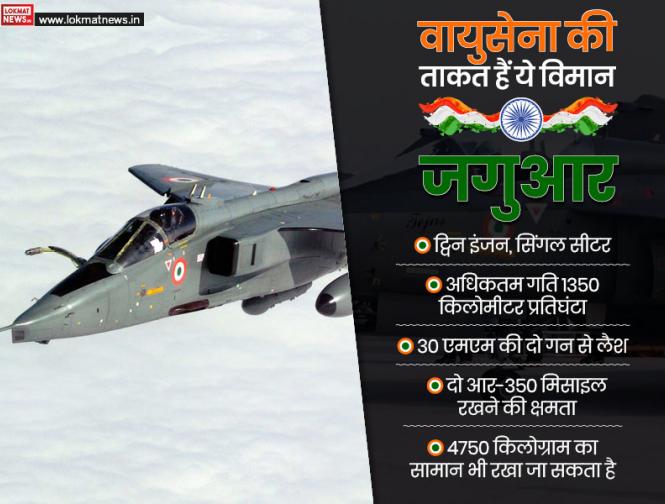 जगुआर: ट्विन इंजन, सिंगल सीटर, अधिकतम गति 1350 किलोमीटर प्रतिघंटा, 30 एमएम की दो गन से लैश, दो आर-350 मिसाइल रखने की क्षमता, 4750 किलोग्राम का सामान भी रखा जा सकता है