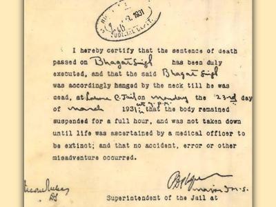 भगत सिंह के डेथ सर्टिफिकेट की कॉपी।