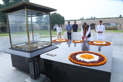 नामांकन दाखिल करने से पहले थरूर ने राजघाट पहुंचकर महात्मा गांधी को श्रद्धांजलि भी दी। (फोटो: Twitter/ANI)