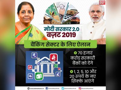 बैंकिंग सेक्टर के लिए ऐलान: 70 हजार करोड़ सरकारी बैंकों को देंगे. 1, 2, 5, 10 और 20 रूपये के नए सिक्के आएंगे।