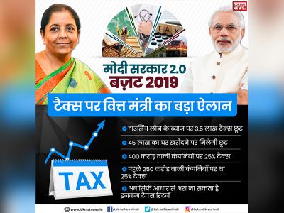 टैक्स पर वित्त मंत्री का बड़ा ऐलान: हाउसिंग लोन के ब्याज पर 3.5 लाख टैक्स छूट, 45 लाख का घर खरीदने पर मिलेगी छूट, 400 करोड़ वाली कंपनियों पर 25% टैक्स, पहले 250 करोड़ वाली कंपनियों पर था 25% टैक्स, अब सिर्फ आधार से भरा जा सकता है इनकम टैक्स रिटर्न।