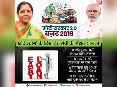 छोटे उद्योगों के लिए वित्त मंत्री की पेंशन योजना: छोटे दुकानदारों को 59 सेकंड में लोन, 3 करोड़ छोटे दुकानदारों के लिए पेंशन, बैंक खाते और आधार योजना के जरिये पेंशन, 1.5 करोड़ टर्नओवर वाले दुकानदारों को पेंशन।
