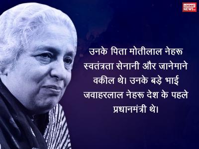 उनके पिता मोतीलाल नेहरू स्वतंत्रता सेनानी और जानेमाने वकील थे। उनके बड़े भाई जवाहरलाल नेहरू देश के पहले प्रधानमंत्री थे।