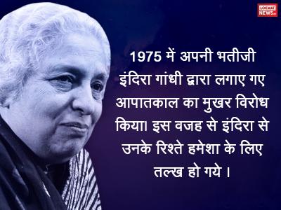 1975 में अपनी भतीजी इंदिरा गांधी द्वारा लगाए गए आपातकाल का मुखर विरोध किया। इस वजह से इंदिरा से उनके रिश्ते हमेशा के लिए तल्ख हो गये।